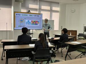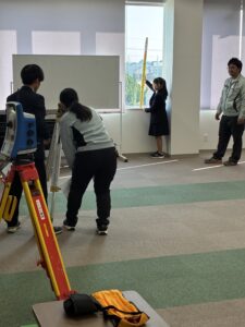 建設業について、鈴木組の取り組みについて「まちづくり」「環境」「地域貢献」をキーワードにSDGsの取り組みを交えながらの説明、測量体験など体験していただいた後、質疑応答ベースのディスカッションで施工管理という職種の理解を深めていただきました。